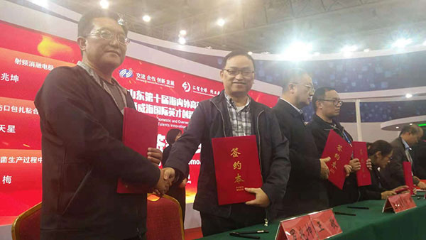 山海天高度重視招才引智工作,在第十屆省海內外高端人才洽談會上,華中科技大學“千人專家”王敬教授作為我市唯一入選的全省20個重點人才簽約項目與天一生物達成“射頻消融電極”項目合作協議,圖為簽約現場。